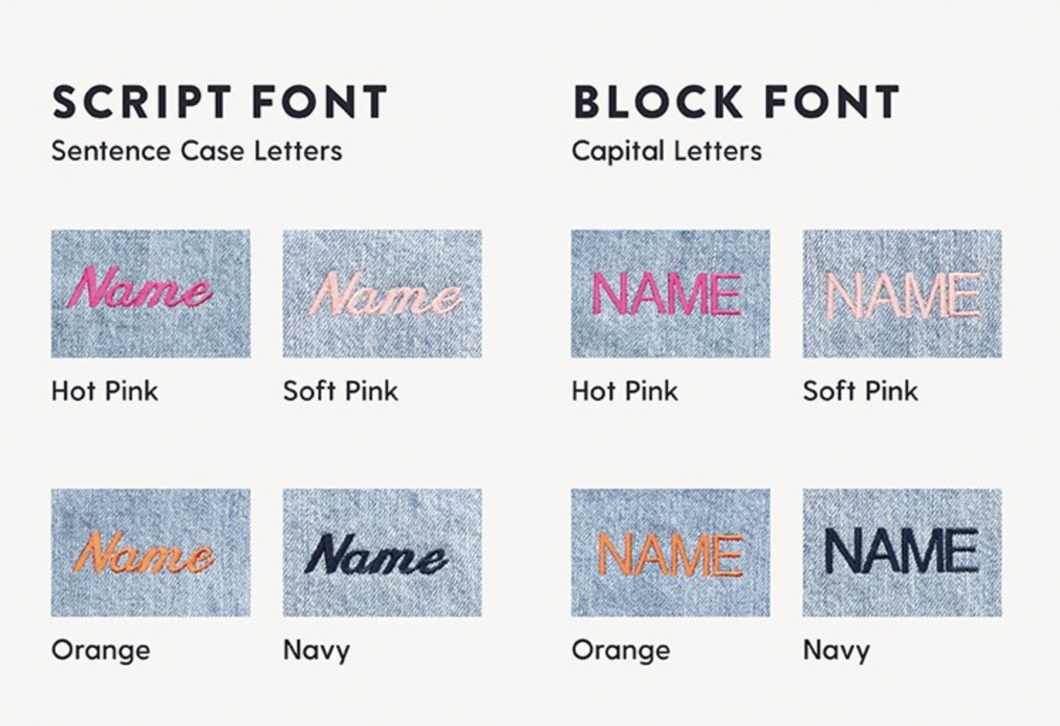Name embroidery is a flat rate fee of $10 per apron with a maximum of 10 characters. You can choose from either script font or block font in either Hot Pink, Soft Pink, Orange or Navy thread.